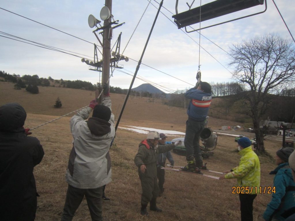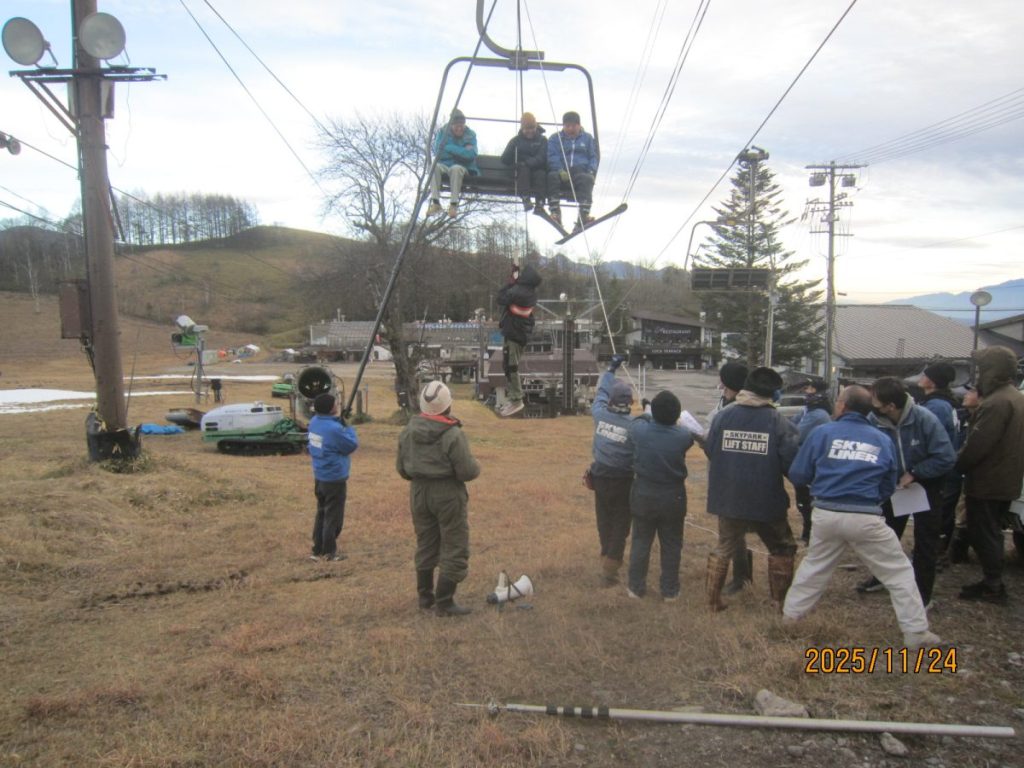 この訓練は、万が一リフトが緊急停止した場合などに、迅速かつ安全にお客様を地上へ救助するための手順を確認し、スタッフの対応能力を向上させることを目的としています。