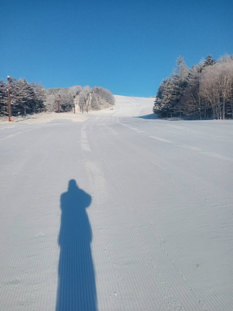 雲ひとつない「車山ブルー」の青空が広がり、ゲレンデにはきれいに圧接されたゲレンデが山肌を白く染め上げています。