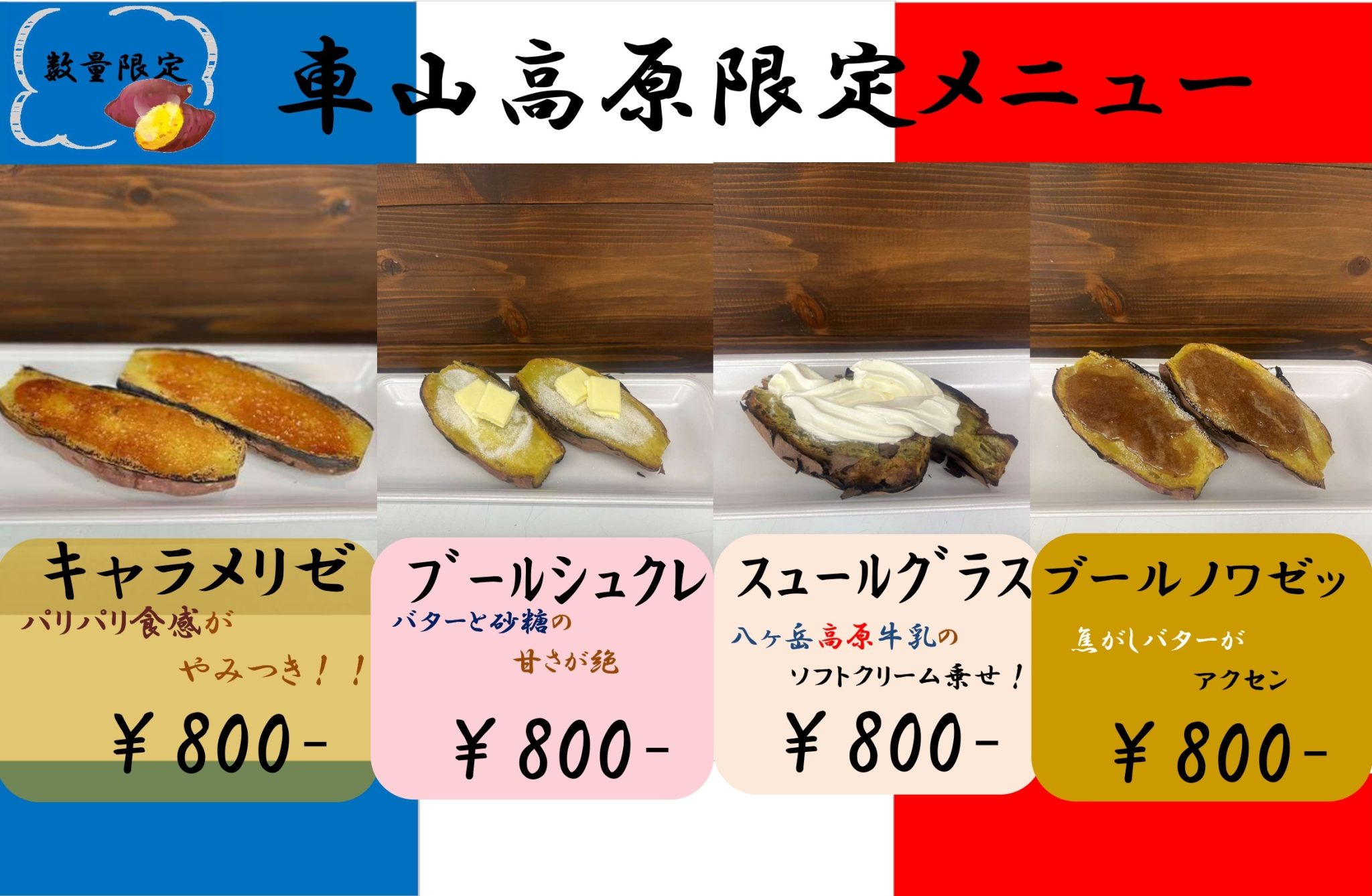 じっくり焼き上げたホクホクの石焼き芋を贅沢にカットし、こだわりのトッピングを合わせました。